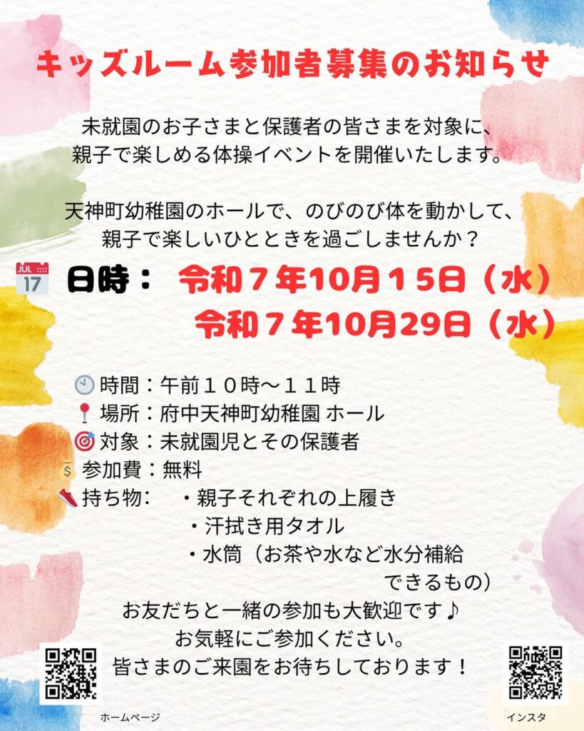 新緑がまぶしい季節、未就園のお子さんと保護者の皆さんを対象にした、楽しい体験イベントが府中天神町幼稚園で開催されます! その名も「キッズルーム」。幼稚園のホールを舞台に、のびのびと体を動かしながら親子で一緒に楽しい時間を過ごせる、特別なプ... -