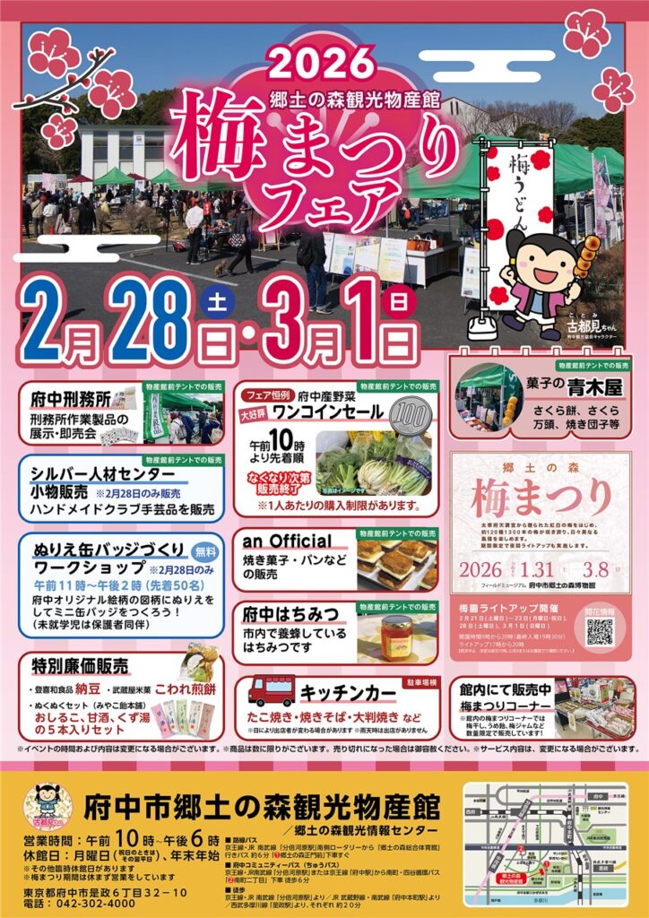 梅の見頃にあわせて、郷土の森観光物産館で「梅まつりフェア」が開催されます。地元グルメや特産品の販売、ワークショップなどが楽しめる2日間です。 画像引用元:郷土の森観光物産館「梅まつりフェア」 | 府中観光協会 開催概要 開催日:2/28(土)・3/1... -
