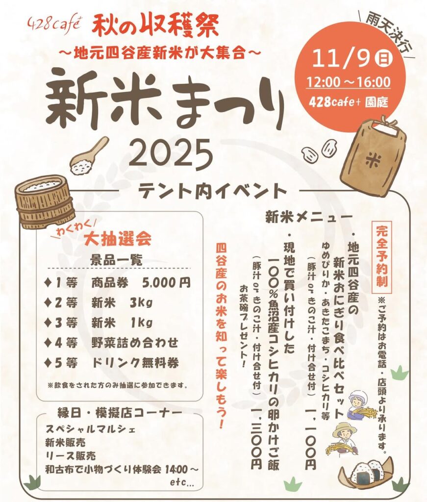 秋の収穫を祝う季節がやってきました!新米ならではのつやつや、もっちりとした美味しさを、心ゆくまで楽しめる「新米まつり2025」が、11/9(日)に428cafe+の庭園で開催されます。地元四谷で採れた新米から、こだわりのブランド米まで、最高に美味しいお米を堪能できる特別な一日です。