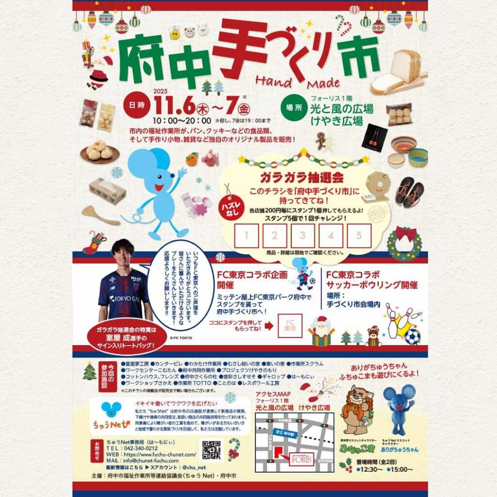 開催は2025年11/6(木)~11/7日(金)の2日間限定。府中の福祉作業所やパン、クッキーなどの食品、そして手作り小物や雑貨など、オリジナルの製品がずらりと並びます