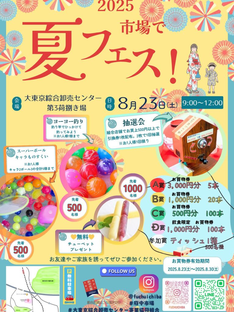 夏の太陽がまぶしい季節、府中市場に熱いイベントがやってきます!いつものお買い物がもっと楽しくなる、大人も子どもも楽しめる「市場で夏フェス!」が開催されます。お買い物券が当たる抽選会や、お子さんに嬉しい無料のゲームなど、魅力が盛りだくさん。この夏は、市場でお得に、そして賑やかに過ごしませんか?