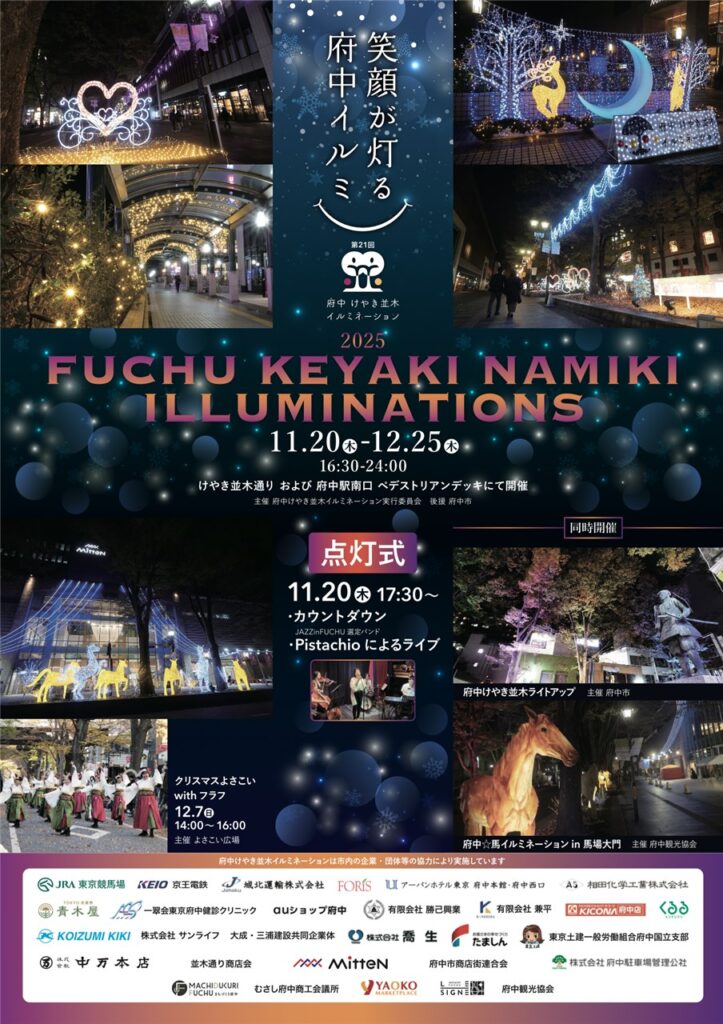 今年で21回目を迎える「府中けやき並木イルミネーション」は、府中駅の玄関口であるけやき並木通りをメインに彩ります。単なる装飾に留まらない、府中ならではの特別なライトアップが同時開催されるのが今年の大きな魅力です!