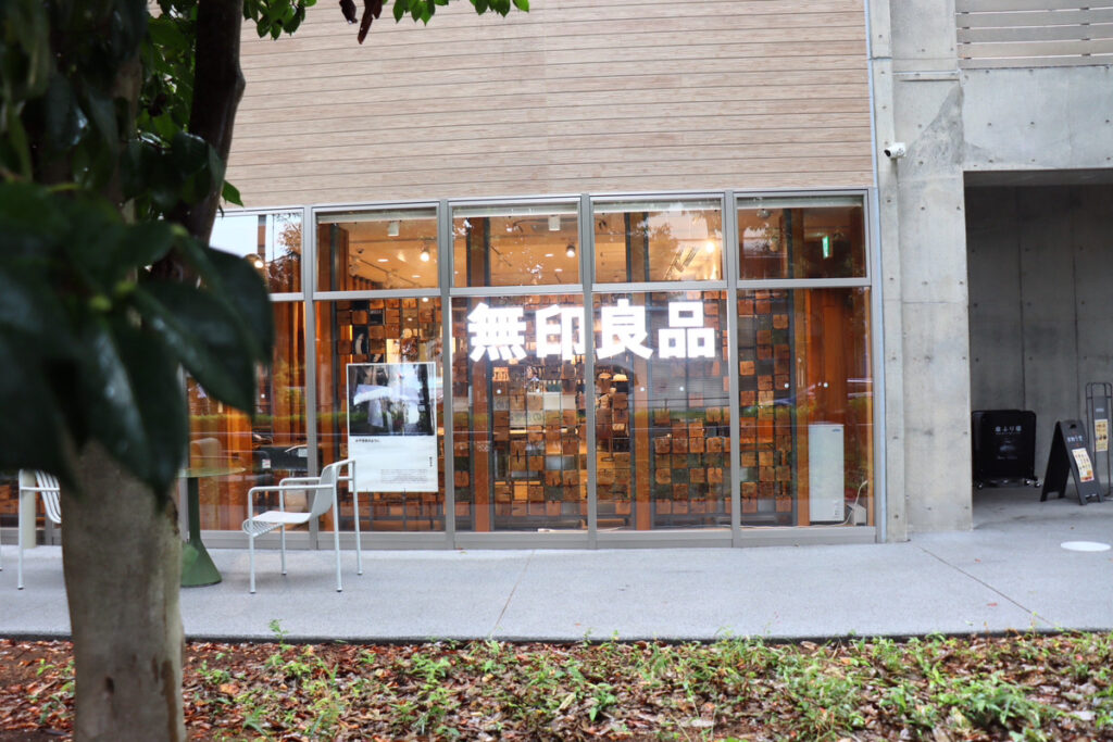 大学の敷地内にある無印良品の広々とした店舗。地域の新たな交流拠点として活用されている。