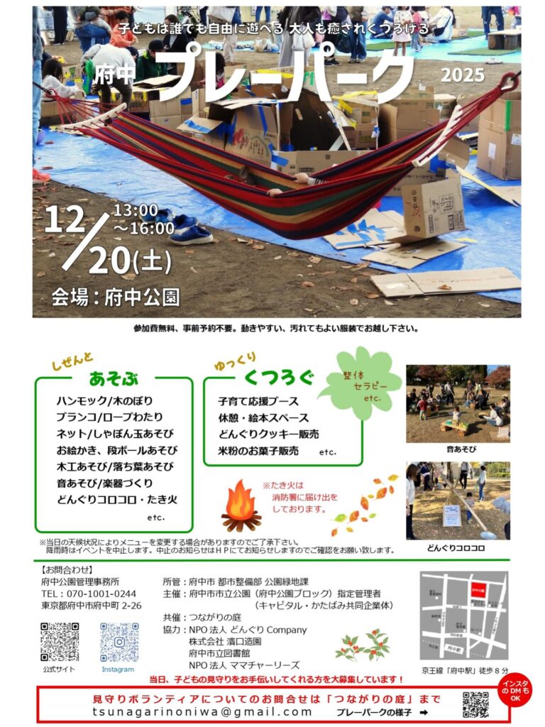 12月20日(土)、府中公園にて《プレーパーク》が開催されます。