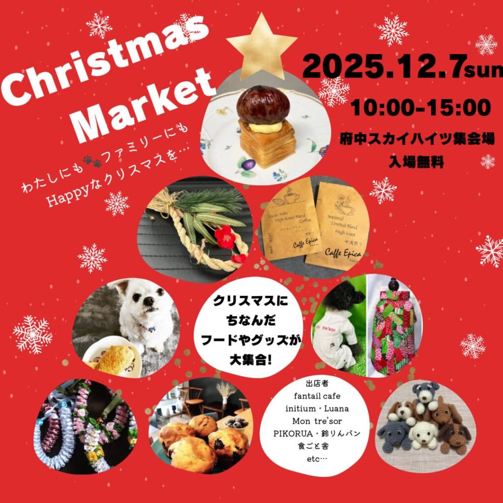府中スカイハイツ集会場で、今年最後のクリスマスマルシェが開催されます。毎年人気のフードや雑貨が並び、今回はご家族の一員であるわんちゃんも一緒に楽しめるものも揃いました。 季節ならではの味わいや、手づくりの温もりが伝わるアイテムが集まる特別... -