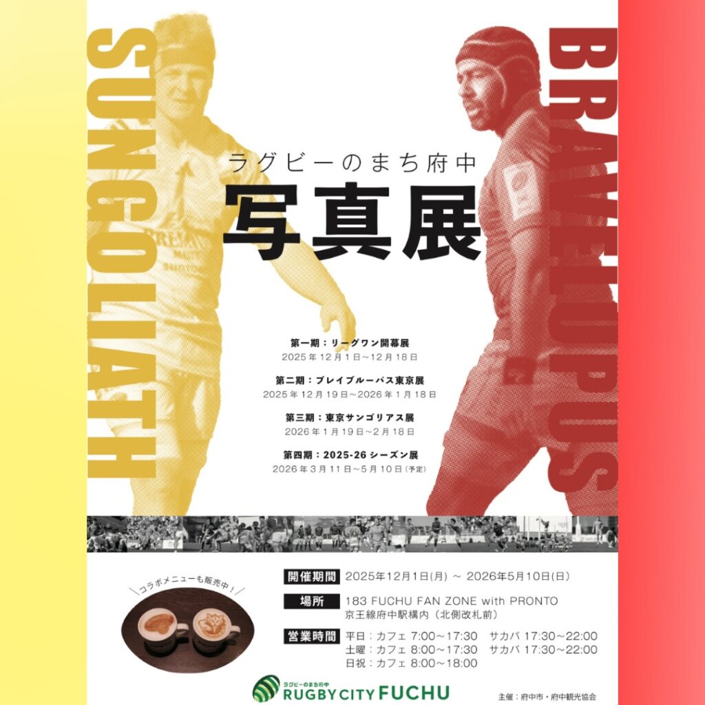府中に拠点を置く東芝ブレイブルーパス東京 と東京サントリーサンゴリアス。その両チームが、183 FUCHU FAN ZONE とコラボした特別な写真展を開催しています。 チームの魅力や迫力を間近に感じられる、“ラグビーのまち府中”ならではの企画です。 画像引用... -